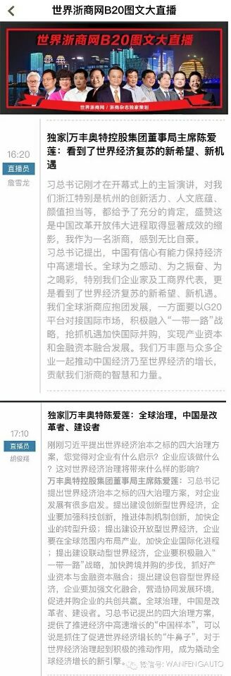万丰奥特控股集团董事局主席陈爱莲出席B20开幕式