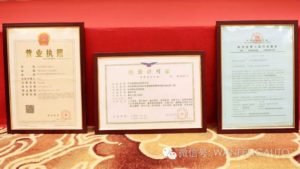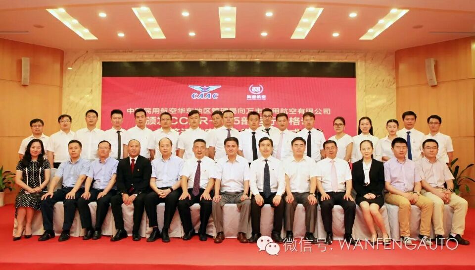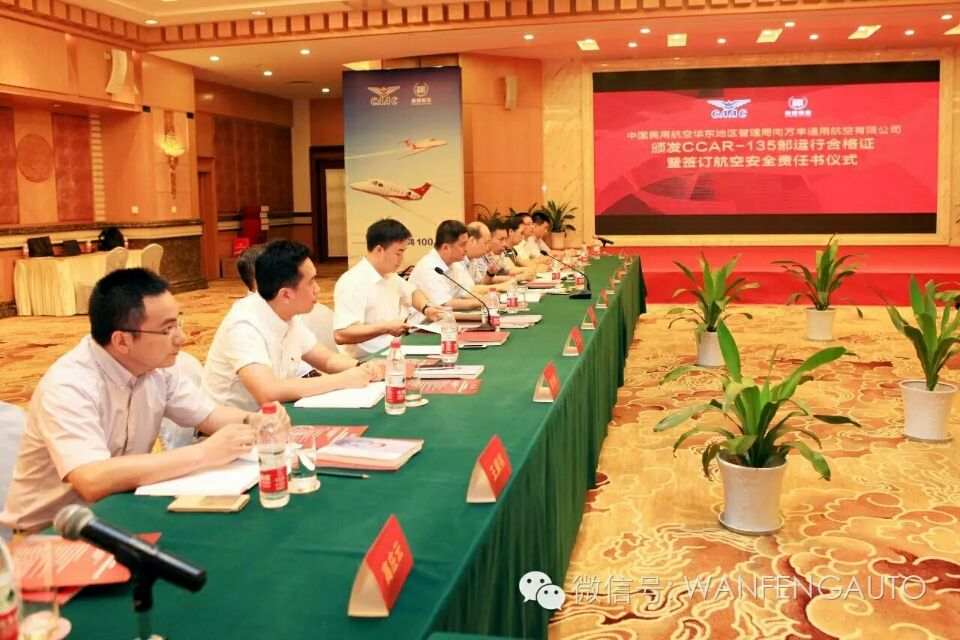 7月29日,万丰通用航空有限公司CCAR-135部运行合格审定颁证会议在杭州举行。民航浙江监管局戴志刚局长向万丰通用航空有限公司总经理张景礼颁发部运行合格证》和《CCAR-145部维修许可证》,这意味着万丰通用航空有限公司获准正式投入运营。